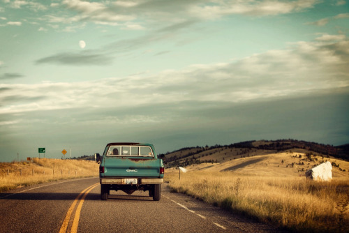 Montana. Big sky and backroad. A day moon in a sky that just celebrated a storm. A beat up truck and a double yellow line. Wheat grass like a sea to islands of tree lined mountains. Home.