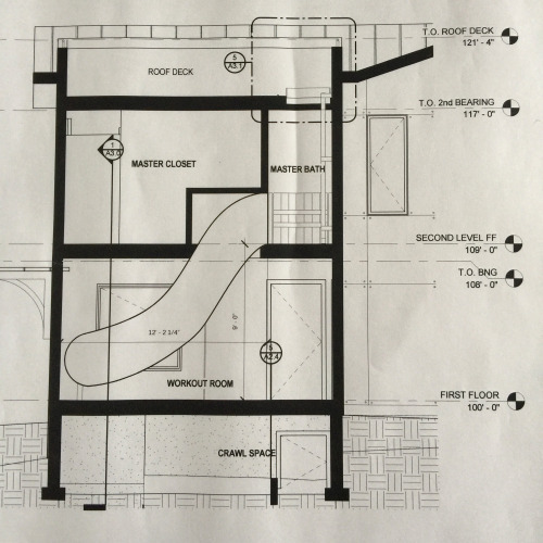 Of all the aspects of my home renovation, one sticks out bold and true as the thing I am most excited for. This is the official approved plan for the indoor slide that will go from my closet down to the main floor, into the workout/rec room. It’s the way I will start every single morning, getting dressed, then sliding downstairs. Our attitude upon waking dictates the day we will have, and I figure there’s no possible way to be in a bad mood when you begin each morning with a little old fashioned fun.