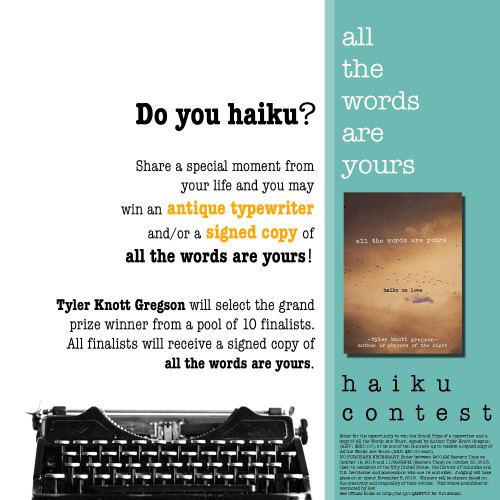 Quick reminder that the fun haiku contest I am running with the amazing @tarcherperigee is still going! To enter, make sure you are following me, @tylerknott, then post an original photo of a haiku about a special moment in your life. Be sure to tag @tylerknott & @TarcherPerigee in the post along with #AllTheWordsBK1 for your chance to the grand prize of an antique typewriter + a signed copy of All the Words Are Yours. Or you could be one of 10 runners up to receive a signed copy of my new book! For more contest rules, check out http://bit.ly/1QMKPTJ