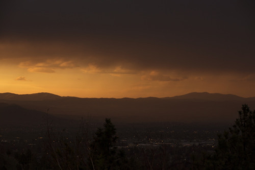 The orange washed rain and the pinpricks of light, twinkling like fireflies making their way through the storm. The purple spilled shadows softened at the edges and the smell that comes with each drop of water. The view from here, the view from home.