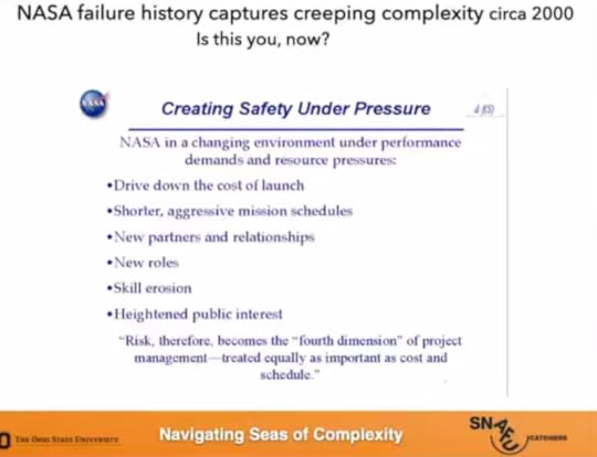 I had planned to write a post on the component substitution fallacy that he referenced, but I didn’t even make it to minute 25 of that video before I heard something else that I had to post first, at the 7:54 mark. The context of it is describing the state of NASA as an organization at the time of the Space Shuttle Columbia accident.