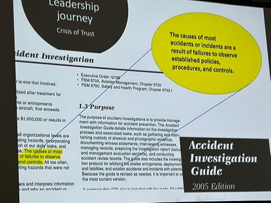 Thanks to work done by Ivan Pupulidy, the Forest Service doesn’t look at incidents this way anymoreThe text in yellow captures what you might call the “old view” of safety, where accidents are caused by people not following the rules properly. It is a great example of what I would call bad social science, which invariably leads to bad outcomes.