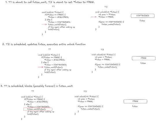 void lock(int *futex) { if(*futex == FREE) { *futex = ACQUIRED; } else { *futex = CONTENDED; futex_wait(futex, CONTENDED); // try again after waking up lock(futex); }}The futex_wait system call will check to ensure that *futex == val. So, if the *futex gets changed, the function will return immediately rather than sleeping.