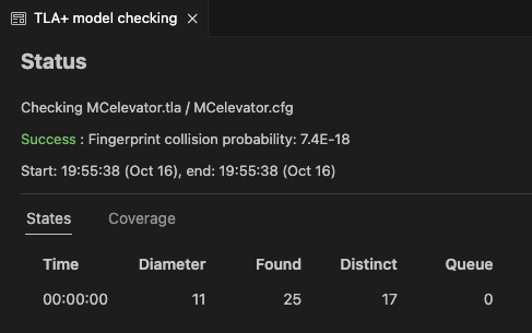 Checking for propertiesOne of the reasons to model in TLA+ is to check properties of the specification. I care about three things with this specification:
