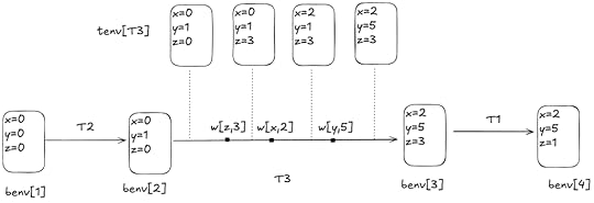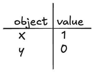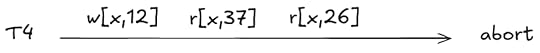 SELECT v FROM obj WHERE k='x';Similarly, I denote a write of y←2 as w[y,2]. This means a transaction wrote the object y with a value of 2. You can imagine this as: