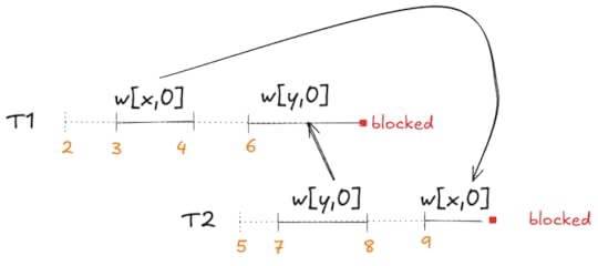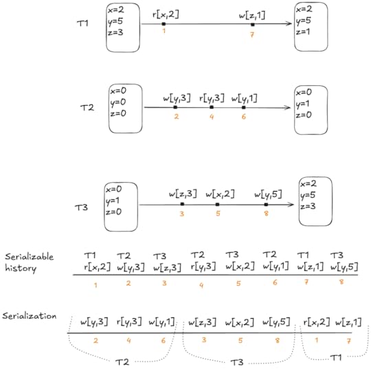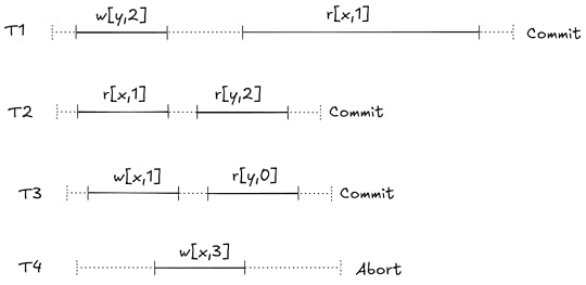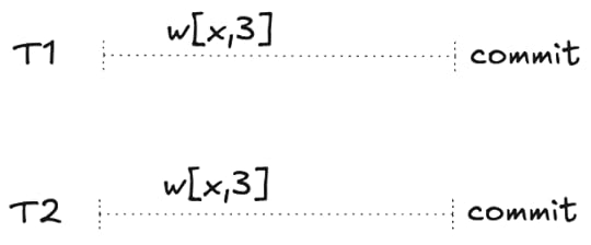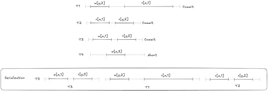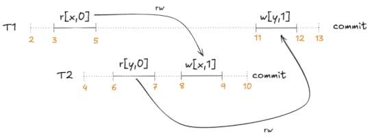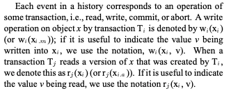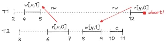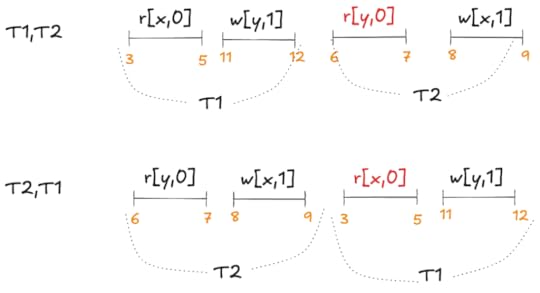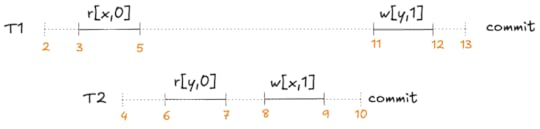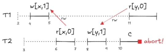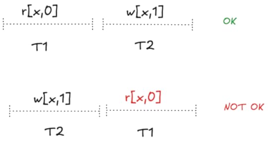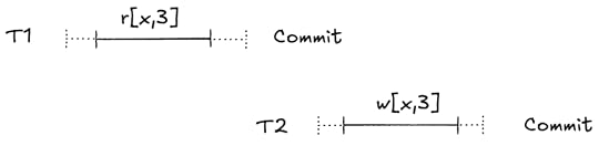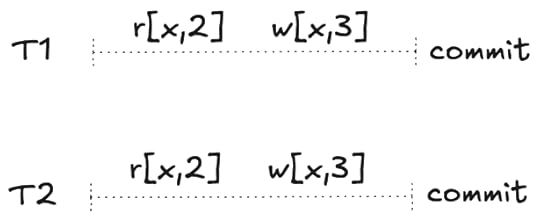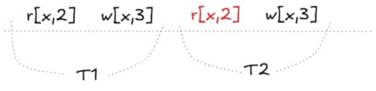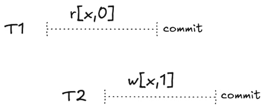 A quick note on conventionsIn this post, I denote read of x=1 as r[x,1]. This means a transaction read the object x which returned a value of 1. As I mentioned in the previous post, you can imagine a read as being the following SQL statement: