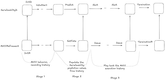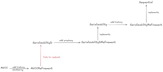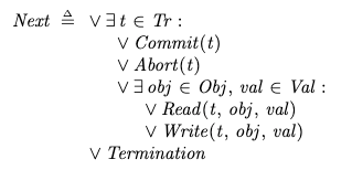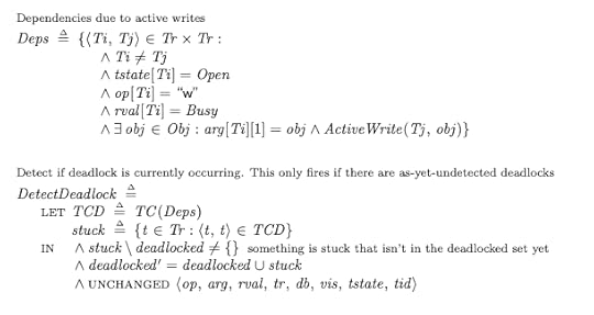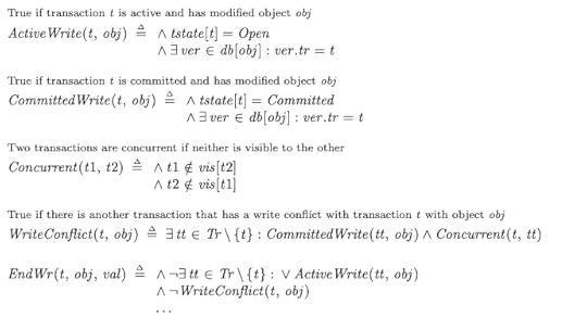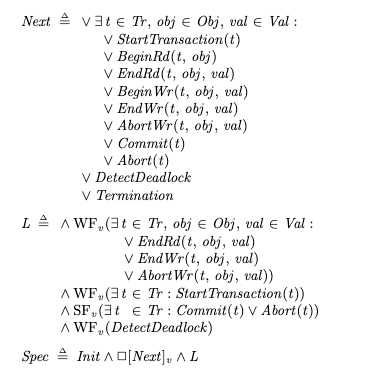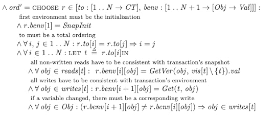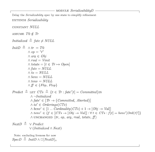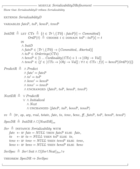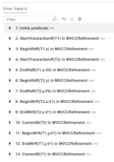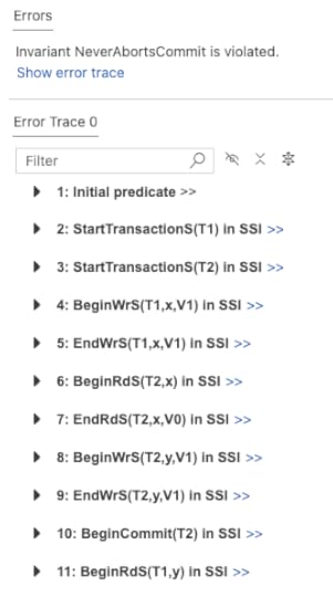 Checking serializability using refinement mappingJust like we did previously with MVCC, we can define a refinement mapping from our SSI spec to our Serializability spec. You can find it in the SSIRefinement module (source, pdf). It’s almost identical to the MVCCRefinement module (source, pdf), with some minor modifications to handle the new abort scenarios.