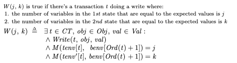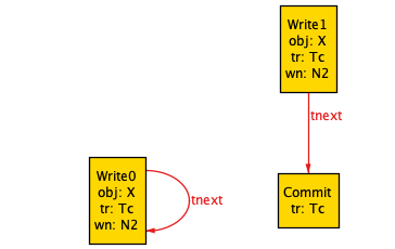 obj – the object being writtenwn – the write numberFollowing Adya, we model the value of a write by a (transaction, write number) pair. Every time we write an object, we increment the write number. For example, if there are multiple writes to object X, the first write has write number 1, the second has write number 2, and so on.
