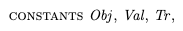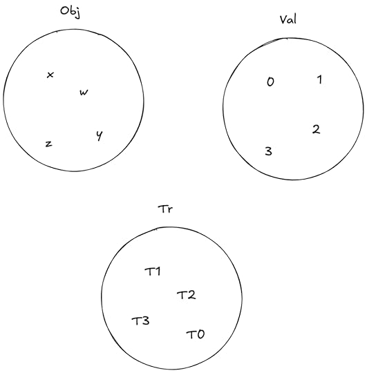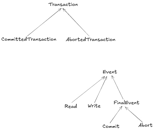 sig Object {}abstract sig Transaction {}sig AbortedTransaction, CommittedTransaction extends Transaction {}The word sig is a keyword in Alloy that means signature. Above I’ve defined transactions as abstract, which means that they can only be concretely instantiated by subtypes.