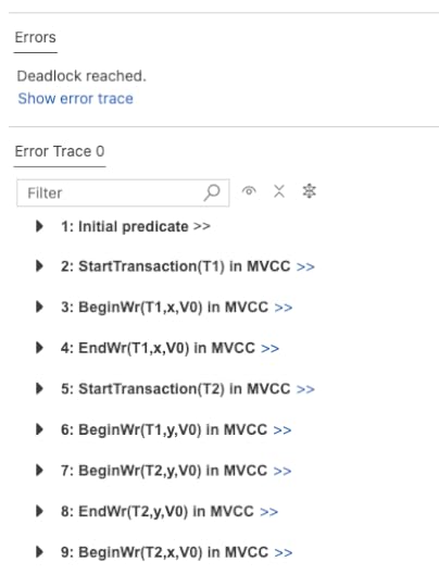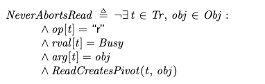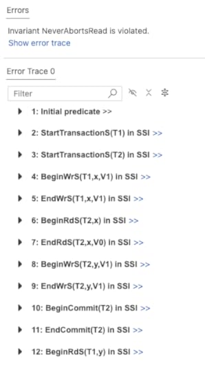 INVARIANT NeverAbortsReadBecause aborted reads can, indeed, happen, the model checker returned an error, with the following error trace: