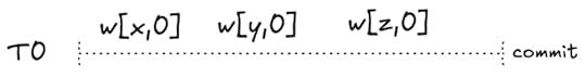 UPDATE obj SET v=2 WHERE k='y';Finally, I’ll assume that there’s an initial transaction (T0) which sets the values of all of the objects to 0, and has committed before any other transaction starts.