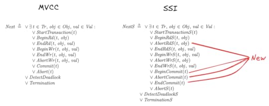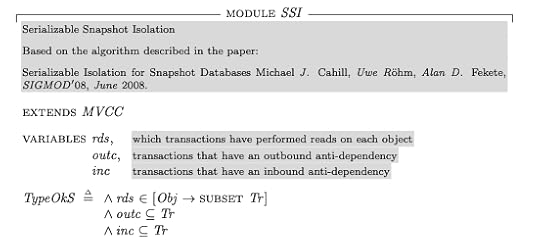 Extending our MVCC TLA+ model for serializabilityAdding variablesI created a new module called SSI, which stands for Serializable Snapshot Isolation. I extended the MVCC model to add three variables to implement the additional bookkeeping required by the Cahill et al. algorithm. MVCC already tracks which objects are written by each transaction, but we need to now also track reads.