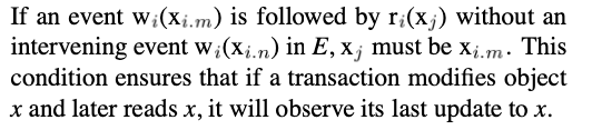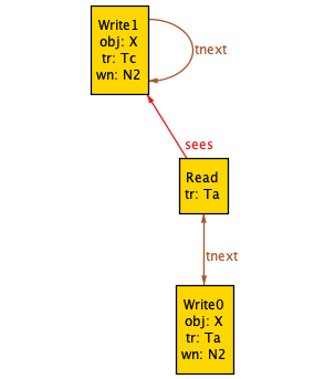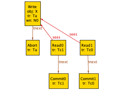 /** * If an event wi (xi:m) is followed by ri (xj) without an intervening event wi (xi:n) in E, xj must be xi:m */fact "transaction must read its own writes" { all T : Transaction, w : T.events & Write, r : T.events & Read | ({ w.obj = r.sees.obj w->r in eo no v : T.events & Write | v.obj = r.sees.obj and (w->v + v->r) in eo } => r.sees = w)}With the facts specified, our generated histories no longer look absurd. Here’s an example: