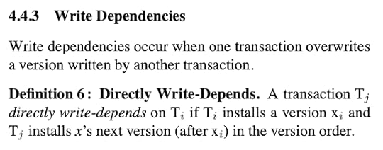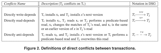 Formalizing phenomena and anti-dependenciesIn his PhD dissertation work, Adya introduced a new formalization for reasoning about transaction isolation. The formalism is based on a graph of direct dependencies between transactions.