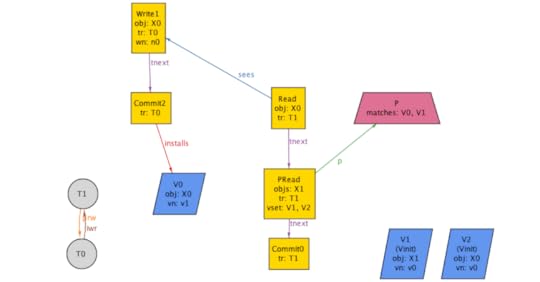 fun ww[] : CommittedTransaction -> CommittedTransaction { { disj Ti, Tj : CommittedTransaction | some v1 : installs[Ti], v2 : installs[Tj] | { same_object[v1, v2] v1.tr = Ti v2.tr = Tj next_version[v1] = v2 } }}Visualizing counterexamplesHere’s a final visualizing example of visualizations. The paper A Critique of ANSI SQL Isolation Levels by Berenson et al. provides some formal definition of different interpretations of the ANSI SQL specification. One of them they call “anomaly serializable (strict interpretation)”.