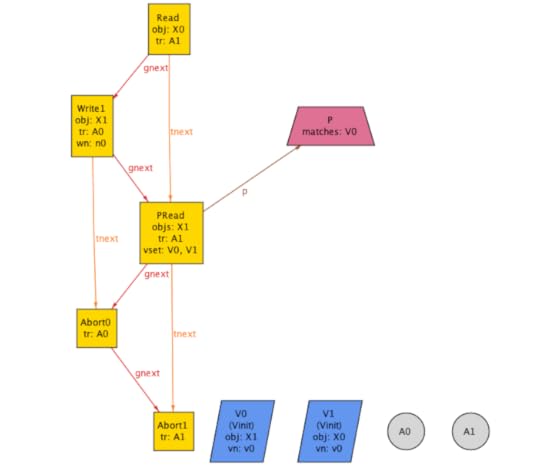 fact "objects in predicate read are the objects that match in the version set" { all pread : VsetPredicateRead | pread.objs = (pread.vset & pread.p.matches).obj}One more counterexampleWe can also use Alloy to show us when a transaction would be permitted by Adya’s PL-3, but forbidden by the broad interpretation of anomaly serializability: