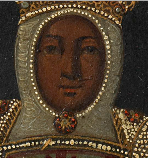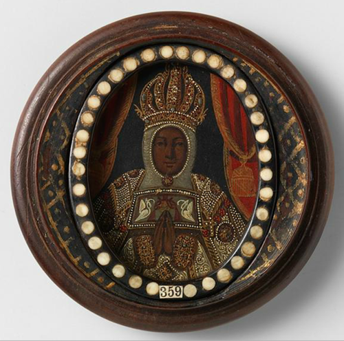 (Effigy of the Black Madonna, bust, on the inside of a round box. With an inscription on the inside of the lid.)