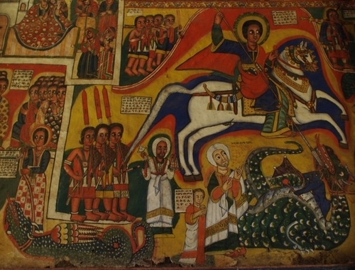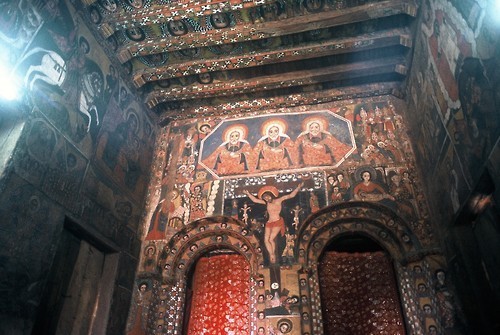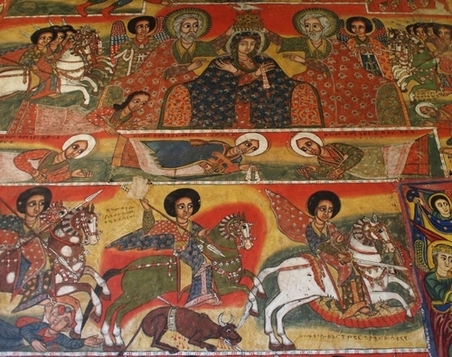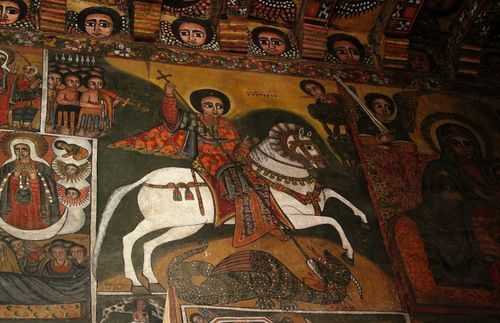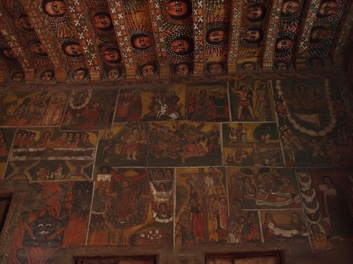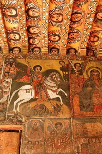 Murals on the walls depict the heroism of Saint George, scenes from the Passion, various other figures from the Bible including Satan, and the ceiling of Selassie Church is covered at its apex with dozens of angel heads that gaze down upon all with what appears to be quiet joy and a kind of mischievous curiosity.