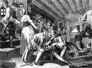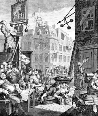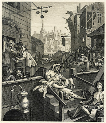 Gin LaneGin was a new drink in England, and because it was strong and cheap it was causing social problems. On “Gin Lane” people pawn their tools and household goods to buy liquor (the three balls over the door signal a pawnshop.) We see people starving, fighting with dogs for bones, abandoning their children, and dying young, as buildings collapse form neglect.