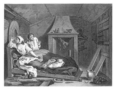 The Distressed PoetMany of Hogarth’s engravings illustrate the homes of the very poor. “The Distressed Poet” shows a would-be writer living in a garret with a foodless pantry and a bill collector at the door. In “The Harlot’s Progress,” a series of six prints, we see a young woman’s seduction into prostitution, and her slow downfall to abject poverty and death. Of special note is the third image, which shows her at home in a common small apartment. The picture is so detailed that we can make out the kinds of cheap artworks the harlot has pasted to her wall – a picture of a famous outlaw, and some trading cards, it looks like.