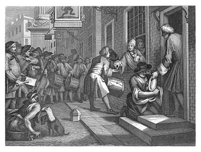 Notice the woman by the door receiving table scraps. A certain level of poverty there folks. When the leavings off someone’s plate is a treat. Lastly we will look at the twin pictures “Beer Street and Gin Lane.” These imaginary streets show the difference between the best side of the English lower classes – the idealized beer drinkers, and the kind of poverty caused by people trying to drown their sorrows in gin.