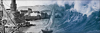 The next tremor caused turmoil in the harbor. Ships tore from their moorings and smashed to pieces, which surged into the town further damaging buildings and beating people to mush. One three-master was lifted up, carried over the ruins, and deposited on top of a house, several hundred yards inland.