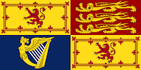 This one features (twice) the three royal lions of England, the single royal lion of Scotland, and the harp of Ireland. (When in Scotland, the flag is changed to this one, with two Scottish lions. Apparently, the Scots are very persistent in getting what they want.