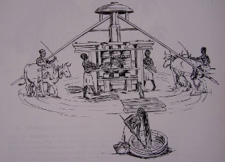The mill used a stone wheel, driven either by harnessed animals or by slave labor, which crushed the stalks. This released the sweet sugar sap, which was drained, collected, refined and boiled until the water evaporated and it became crystallized sugar.