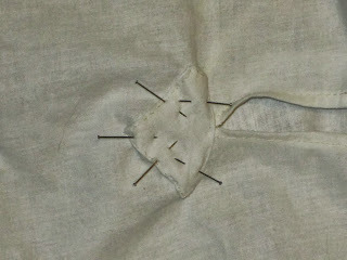 To attache the collar, pin the center of the collar piece to the center of the gathered back neck opening. Pin the front edge of the collar to the finished edge of the front opening, leaving 1/2" of collar for hemming. Pin the length of the collar along the neck opening, adjusting the gathering at the back so that the collar fits the neck opening. Repeat on other side.