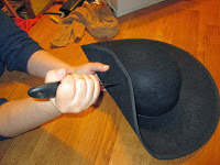 If the crown of your hat isn’t the shape you want (my last pirate hat started out with a shape more like a cowboy hat) change the shape by filling the crown of the hat with warm water and letting it sit for a few minutes. Then use your fist to punch the hat into shape. You can also make a too-small hat bigger by wetting it and then forcing it onto your head and wearing it until it’s dry.