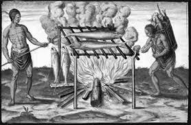 Making smoked meatThese were casual pirates. Their main interest was the illegally harvested wood. Logwood is a small tree which grows in clumps close to the seashore. Technically, the tree is a legume. It produces a single, edible bead in each of tis many small pods, and flowers with lovely yellow blossoms.