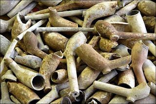 One of my favorite observations about the culture comes from an archaeological excavation of a log-cutter camp. The remains of several such camps have been examined, but this one provided something different. Literally hundreds of clay pipes, almost all broken, were scattered around the site. The archaeologist had no idea why this camp should be so well-stocked with pipes, or why they lay in broken heaps.