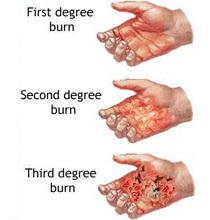 A third degree burn really looks like a burn. The skin is bright, meaty red and falls off in chunks. Underlying tissue is exposed and damaged. The body loses moisture from the opening, and the victim risks shock, dehydration and death.