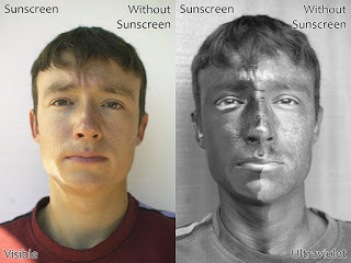 Regular application of sunscreen can offer real protection, but it must be renewed regularly. For best results, it should be applied 30 minutes before going out into the sun, and renewed about an hour after. Sweating or swimming requires more frequent applications. Even though you may not see the difference after exposure to moderate sunlight, UV photography can show an improvement.