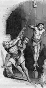 Most closely linked with the Inquisition was a torture method called strappado. In this, the victim’s arms were tied behind the back, then attached to a rope and pulley. The victim was lifted by the bound arms, and sometimes dropped and lifted again.