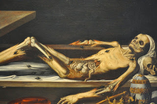 But these images of the Grim Reaper did not usually show a clean skeleton. Bodies don’t simply dissolved into skeletons. Instead, depictions of death show bodies with strips of skin still attached. Skin broke open first over the joints, the eyes sank and the structure of the face fell in. Images show the dead with internal organs falling from burst abdomens, with hair still attached to naked skulls.