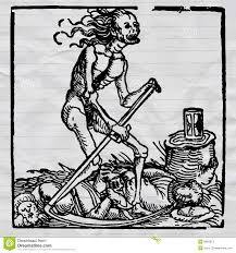 It was the Black Plague that gave Death a personification. Usually a skeleton or skeletal figure, Death carried a scythe to reap the lives of the living. Or a bow-and-arrow to strike from a distance. Death might also bear a shovel, the better to bury his victims.