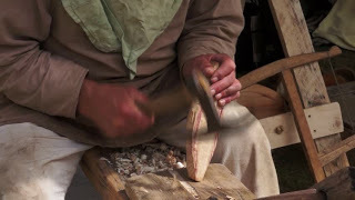The first tool of an 18th century Carpenter was his work bench. This was a sturdy block of wood, about six feet long and about 18 inches wide. It had 4 strong legs on each end, making it unlikely to tilt of wobble. But unlike modern work-benches, it was chair-height instead of table-height. The reason was simple. The screw vise that we use today to steady a piece of wood we ae working on was not yet a common tool.To keep a piece of wood steady, the carpenter placed it on the bench and then simply sat on it. This worked quite well for most applications. The Carpenter would sit, and then saw, drill, or chisel the wood to the desired shape.