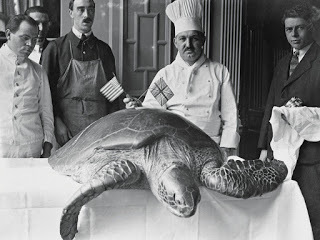 A typical recipe for turtle soup “in the wild” suggested cooking and eating the center loin muscles, then chopping up the rest of the meat, adding spices (thyme, parsley, savory and young onions, according to one recipe) and a couple of bottle of wine. The turtle’s tripe and maw (the digestive tract) were considered the best part, and cooks encouraged them to be boiled in veal stock, with plenty of added butter. Killing and dressing a 400 pound turtle took hours. And cooking it took even more. 6-8 hours were needed to prepare the dish.