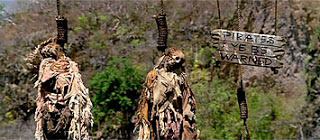 It’s the opening of Pirates of the Caribbean – Curse of the Black Pearl. Captain Jack in his raggedy rowboat sail past a string of hanging corpses. “Pirates Be Ye Warned” says the sign. Jack pauses his bailing to salute his fallen comrades, even as his own craft begins to sink.