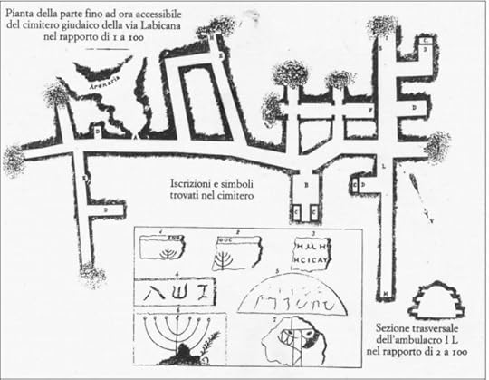 Anzi il medesimo pose a mia disposizione nel Gennaio 1884 il sunnominato cavatore Luigi Caponi con altri due lavoranti della Commissione di sacra archeologia, ma per tre giorni soltanto non potendoli più a lungo distogliere dai consueti lavori delle catacombe romane. Per quanto breve fosse il tempo concessomi, pure potei riuscire a trovare fra le terre alcuni frammenti di terra cotta con iscrizioni e simboli giudaici ed a sgombrare dalle macerie una tomba arcuata con lettere ebraiche dipinte.
