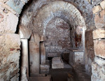 Nei suoi pressi, gli scavi hanno rivelato la presenza di un edificio tardo-romano a funzione pubblica, ricco di mosaici ed affreschi, che si sviluppava intorno ad una corte centrale, dotata di portico, da cui prendeva aria e luce. Le strutture relative all’edificio absidato documentano diverse fasi di costruzione che si concludono con un incendio: della fase del II sec. d.c. restano le pavimentazioni che offrono una variegata esemplificazione di mosaici geometrici in bianco e nero. Di questo edificio sono stati indagati tre importanti settori: l’atrium (ingresso), l’impluvium (il bacino per la raccolta dell’acqua piovana) ed il tablinium (il vano di rappresentanza).