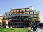 Due piani più sotto, invece, spiccano imponenti, i verdi balconi in muratura. A forma di triangolo, con la punta che si erge verso l’esterno, i balconi lasciano poi spazio più sotto a pareti con grandi rombi sui cui spuntano finestrelle ottagonali. E a dare un ulteriore tocco di vivacità e colore i vasi rigogliosi di fiori e le tende da sole rigate