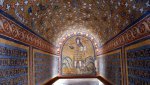 E proprio su un globo di calcedonio è seduto il Cristo, rappresentato come un giovane senza barba, tra gli Arcangeli Michele, la Giustizia, e Gabriele, la Potenza, nella teofania dell’abside di San Vitale, per simbolizzare il suo dominio sull’intero Cosmo. Nel suo essere Imperatore del Creato, archetipo eterno di quello terreno, celebra il valore di Vitale, vestito come un ufficiale delle Scholae Palatine, le unità di cavalleria d’élite dell’esercito, donandogli la corona del martirio e riceve l’omaggio del vescovo Ecclesio, che gli offre in pegno il modellino della basilica.