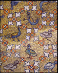 Per ribadire all’osservatore tale concetto la citazione dello scettro dell’imperium è ripetuta più nei numerosi globi azzurri del presbiterio sormontati dai pavoni, simboli della gloria e magnificenza divina . A questi si associa, come sfondo, un prato con fiori rose e gigli, che oltre alla valenza religiosa, ne assumono anche una civile.