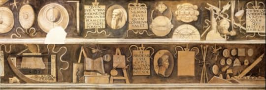 La prima parte del fregio riporta libri e oggetti per scrivere. Segue una sequenza di immagini riferentesi all’astrologia e all’astronomia: una sfera celeste con i simboli dello zodiaco (vi compaiono, tra il Sole e la Luna, i segni dell’Ariete, dello Scorpione, del Cancro, dei Pesci e della Bilancia), un sestante, strumento usato in navigazione per orizzontarsi, e una sfera armillare che reca alla base il cartiglio “Sphera mundi”. Si tratta di uno strumento a cerchi concentrici mobili, simulanti le orbite planetarie ruotanti attorno al piano dell’equatore celeste, usato nel Rinascimento e anche in seguito per eseguire calcoli astronomici ed astrologici.