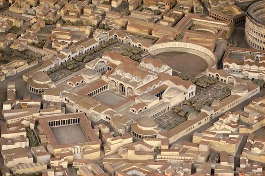 Terza, la grande piscina a nord del frigidarium che fu spostato al centro dell’edificio, nell’incrocio dei due assi principali. Sia dal punto di vista architettonico che quello funzionale il frigidarium divenne il fulcro del complesso. Altre novità importanti furono le file di finestre lungo la facciata meridionale, tutte a vetro, per la luce e il sole d’inverno, ma aperte e ombreggiate da tende d’estate per il fresco. Essendo poi gli ambienti del settore centrale allineati sull’asse longitudinale delle terme, mentre sui due lati si sviluppava un duplice e simmetrico giro di stanze di passaggio, si consentiva ai frequentatori dei bagni di scegliere due percorsi, evitando l’affollamento, che dagli spogliatoi li conduceva al caldarium, situato all’estremità meridionale dell’edificio. Inoltre, dovevano trovarvisi non poche opere d’arte: ben 25 statue vennero rinvenute nel 1547 dal Cardinale Trivulzio. In questa zona sono in corso i restauri delle grandi esedre delle Terme di Traiano.