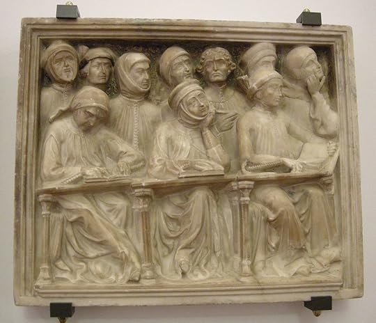 Ebbene, questa consolidata abitudine è tanto vecchia quanto l’Università stessa. Nell’Alto Medioevo, in cui gli alfabetizzati, per ragioni di culto, erano essenzialmente gli ecclesiastici, la produzione, la circolazione e la lettura dei libri erano confinate all’interno dei monasteri. Il libro, destinato alle lettura collettiva ad alta voce, per esigenze di preghiera o di meditazione, che avvenivano o nel chiostro o nel refettorio, durante i pasti, aveva il valore di bene di lusso e di status symbol: il produrlo e donarlo era indicativo del potere e della ricchezza del convento.