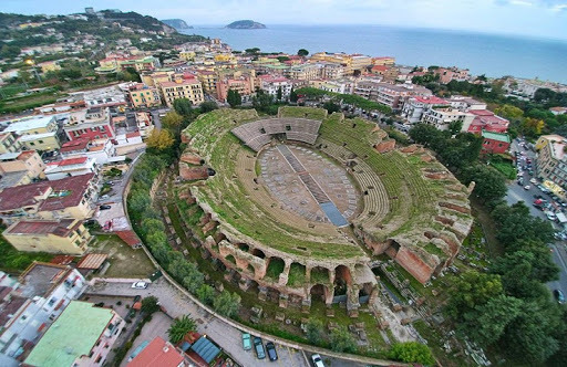 L’arena vera e propria (75x42m) è traforata da una serie di botole quadrangolari, collegate ai sotterranei, attraverso le quali le gabbie con le belve venivano issate, durante i ludi gladiatori. Il piano era attraversato, lungo l’asse est-ovest, da una profonda fossa lunga 45 m, che scendeva sino ai sotterranei; coperta con tavole di legno, durante i giochi da essa venivano sollevate le scenografie o altro materiale necessario per gli spettacoli. Durante un recente intervento di restauro del monumento, seguito alla crisi bradisismica del 1983-84, è stato possibile recuperare l’intero settore dell’ima cavea, i cui gradini conservano ancora l’originario rivestimento dipinto in intonaco chiaro, poi protetto con una superficie di sacrificio. L’ima cavea era destinata a ospitare le élites cittadine. Gli altri settori non sono conservati, sia perché andati distrutti nel corso del tempo,sia in seguito ad un non corretto intervento di restauro, eseguito negli anni ’70 del Novecento.