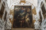 Quasi identico è l’arco trionfale in alto al centro di entrambi i dipinti così come la santa Oliva di Van Dyck, in primo piano sulla destra della pala (riconoscibile grazie al rametto di ulivo che ha in mano), è quanto mai prossima – per posa, fisionomia e solidità della massa – alla santa Domitilla di Rubens.